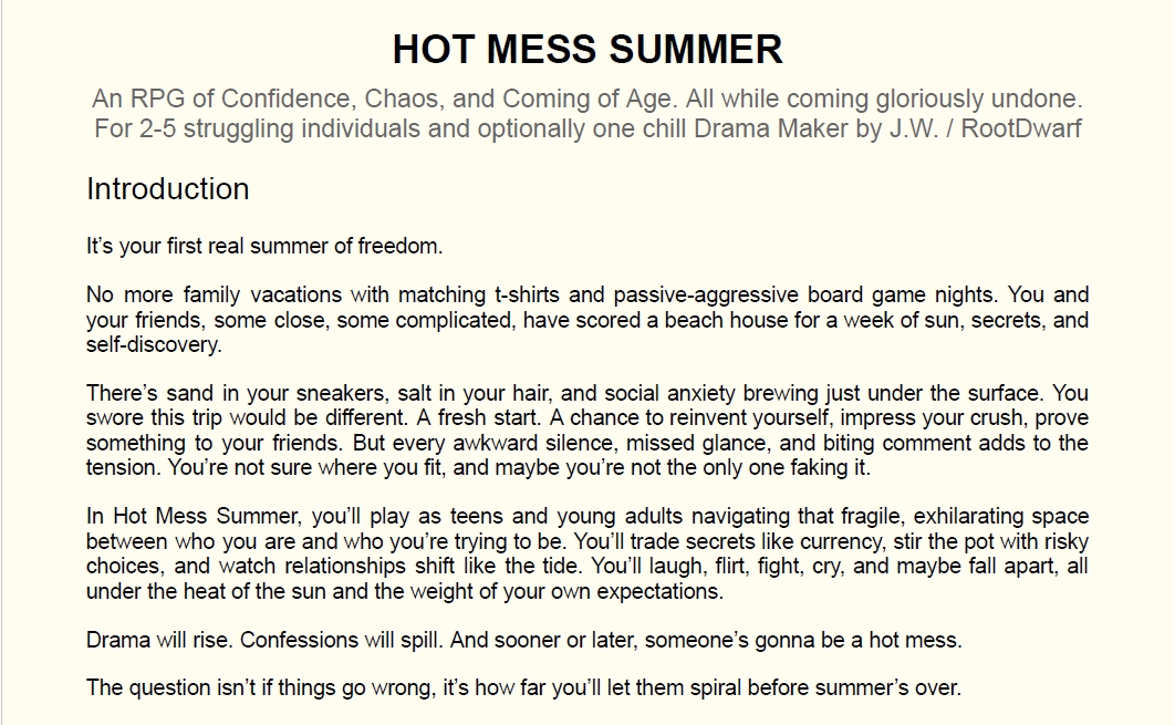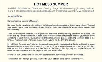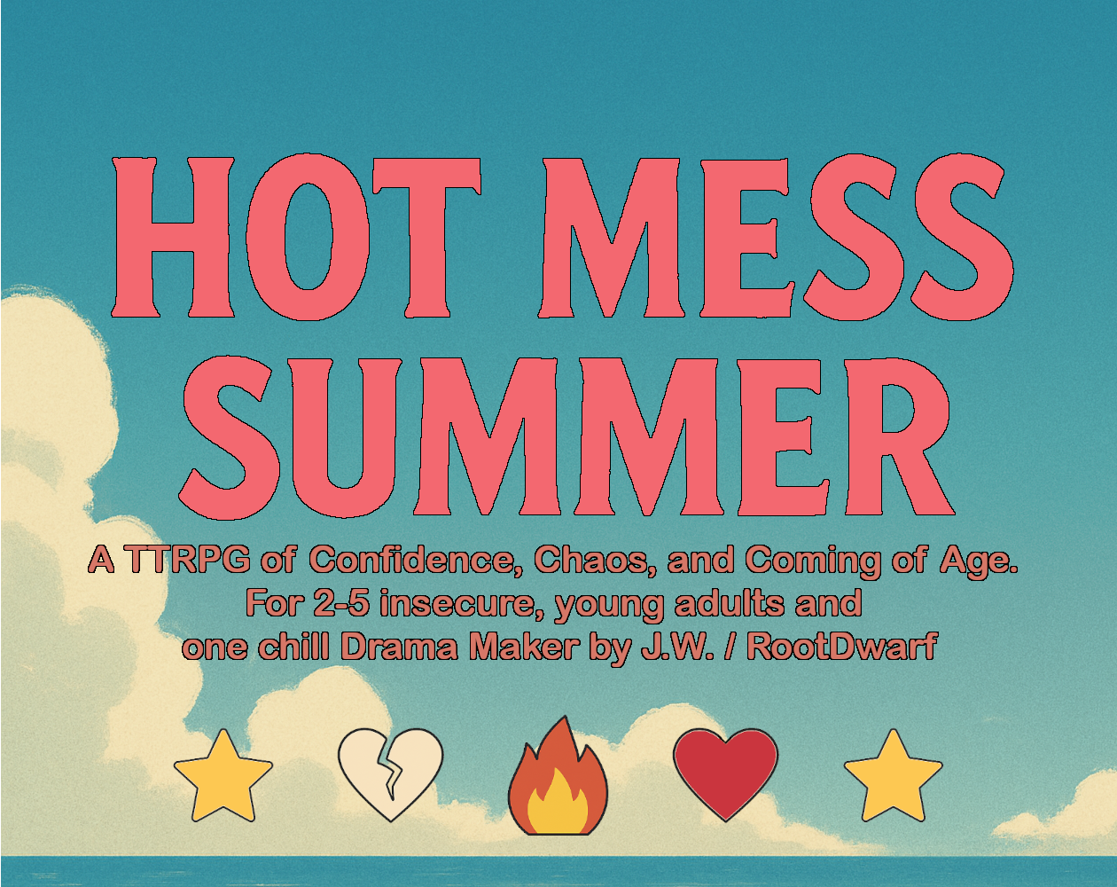 Hot Mess Summer is a lighthearted, drama-packed tabletop role-playing game for 2–5 players about unstable friendships, insecurities, secrets, and chaos during one unforgettable summer vacation. Your characters are young adults hanging out at the beach, the pool, the boardwalk, and late-night house parties—away from their parents for the first time and navigating tricky social waters, where everything can spiral into embarrassment, conflict, or full-on meltdowns in the blink of an eye.