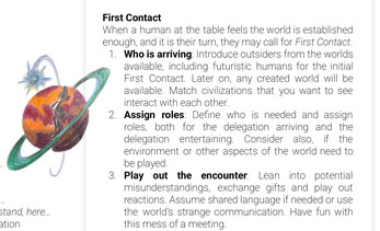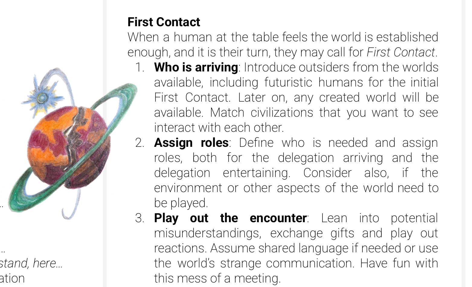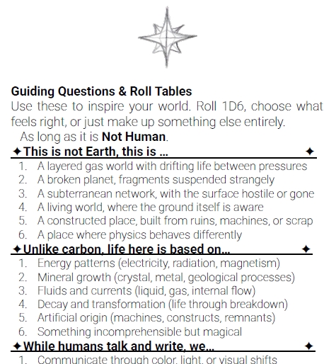 In this collaborative worldbuilding TTRPG, explore as a group of humans (a.k.a. players) the depths of potentially, well actually very, different worlds and the lives these places might spawn. Create them based onguiding questions and some roll tables, or just make facts up as you go. Only rule: They can be anything but Not Human. Once happy with the world and its inhabitant(s), establish some First Contact with another world, may it be future humans or from one you created earlier. Play out a little scene and enjoy the fragility and obsurdity of worlds colliding in this diplomatic dance.