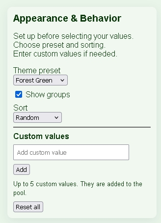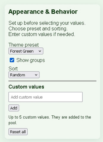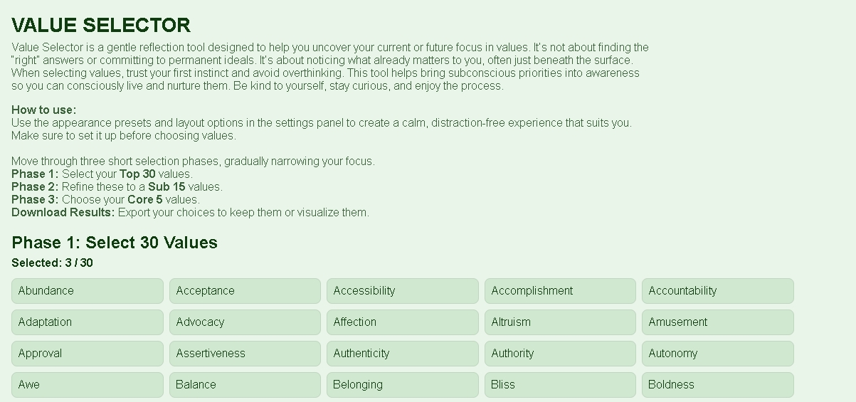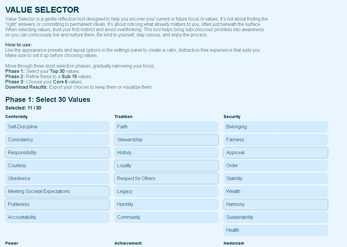I’m releasing this HTML Value Selector around the New Year, a time when many of us reflect on our values and realign for the next chapter. I’ve personally used this as a small reflection tool in different forms for several years now. I originally started doing this manually, selecting values, graphing them out, and keeping the results visible as a quiet reminder of what I wanted to focus on in a given season of life. Over time, this process became less about optimization and more about awareness.
