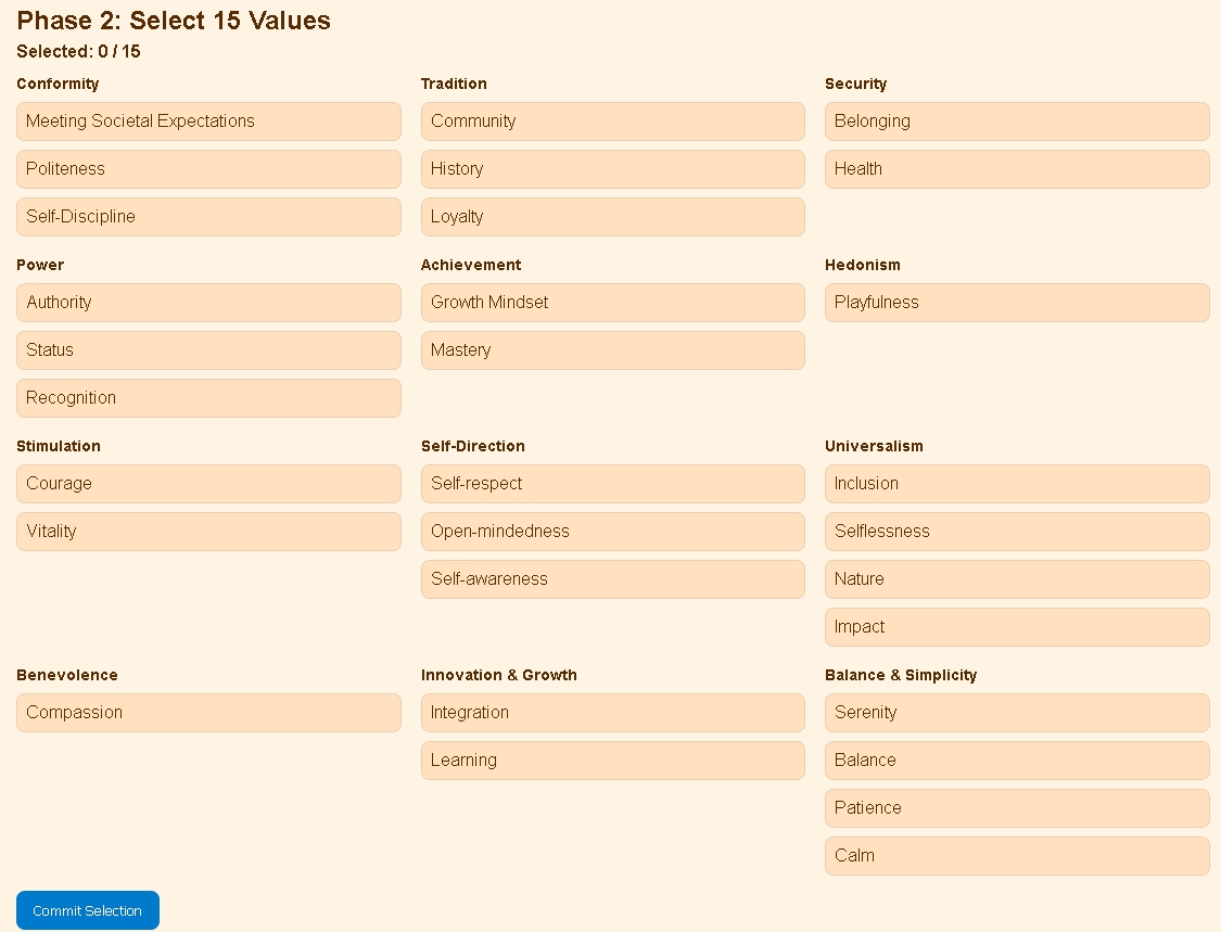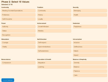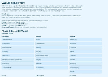 - Phase 1 invites broad intuition by selecting your Top 30 values